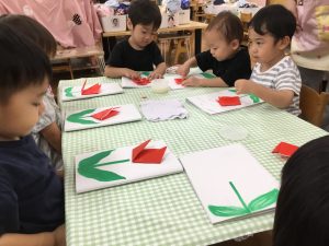 折り紙の使い方・折り方を知ったり、決まった方向に線を書く練習をしたり、指先をしっかりと使い、折り紙を適度な大きさにちぎり、ちぎる感触と音を楽しんだりする等の目的を絵ノートを通して行います。
