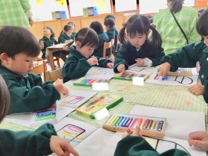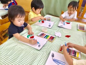 2才児さんは5月から月に一度、絵ノートを使って造形技法向上活動を行っています。クレヨンで絵を描いたり、折り紙を折ってのりで貼り付けたり、