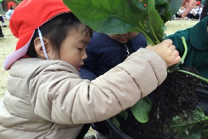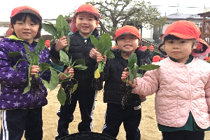 松操保育園では、「しょうそう菜園」といって、夏はナスやキュウリなど野菜を育てている場所があります。冬の今は、ほうれん草を育てており、先日子ども達でほうれん草の収穫をしました♪